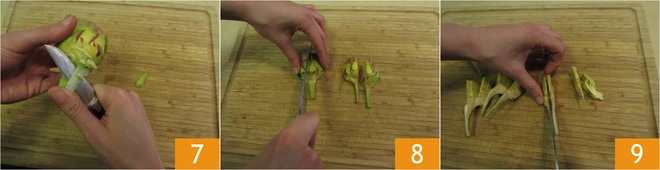 Con un cuchillito pela el tallo restante para eliminar la parte externa más dura 7. Corta las alcachofas en cuartos 8 y luego cada uno en 16 gajos pequeños 9.