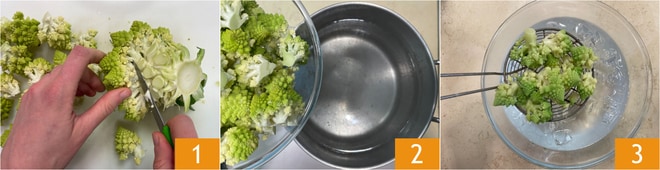 Para preparar el risotto con brócoli y bagna caoda rápida, lo primero que debes hacer es limpiar el brócoli romanescu 1, luego sumerge las flores en una olla con agua hirviendo con sal 2 y escáldalas durante unos 4-5 minutos. Escurre los brócolis en un bol con agua fría y hielo 3. Conserva y mantén caliente el agua de cocción porque servirá para cocinar el risotto.