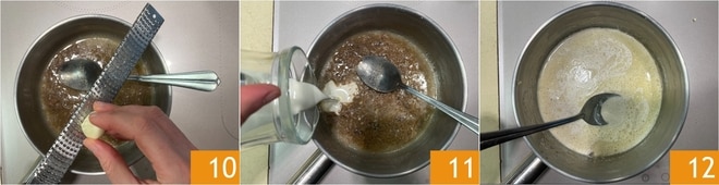 Añade un cuarto de diente de ajo rallado 10, luego vierte la nata 11 y deja reducir a fuego lento durante unos minutos 12.