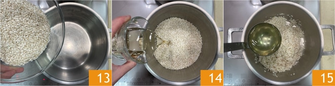 Ahora dedícate a la cocción del risotto: vierte el arroz en una cacerola 13, añade sal y tuéstalo en seco, removiendo continuamente. Cuando los granos estén muy calientes al tacto, añade el vino blanco 14 y deja evaporar completamente. Comienza a cocinar el arroz añadiendo un cucharón a la vez del agua de cocción del brócoli 15, esperando siempre a que se absorba el líquido antes de verter el siguiente.