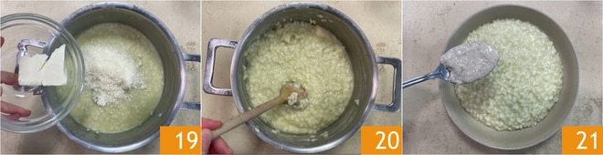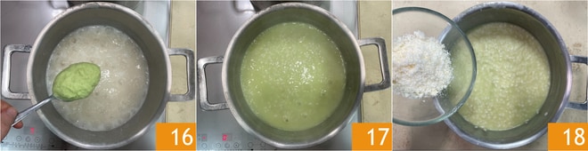 Hacia la mitad de la cocción, añade la crema de brócolis 16 y termina de cocinar el arroz 17. Una vez cocido, apaga el fuego y manteca con el pecorino y el Parmesano rallados 18.