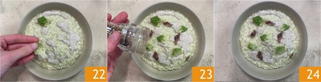 Completa con las flores de brócoli reservadas 22, los trozos de anchoa y una pizca de pimienta 23. ¡Tu risotto con brócoli y bagna caoda rápida está listo para servir 24!