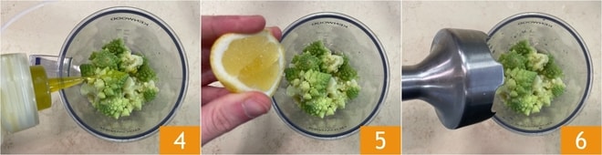 Transfiere los brócolis a un vaso, teniendo cuidado de reservar algunos para presentar el plato, luego añade el aceite 4, el jugo de limón 5 y la sal. Tritura con una batidora de mano 6.