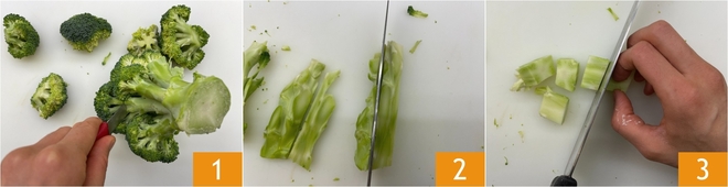 Para preparar el risotto con brócoli y pecorino, primero haz el caldo vegetal y mantenlo caliente. Limpia el brócoli: elimina las hojas externas y saca las flores más pequeñas 1, luego limpia el tallo quitando las partes externas más duras 2 y córtalo en cubos 3.