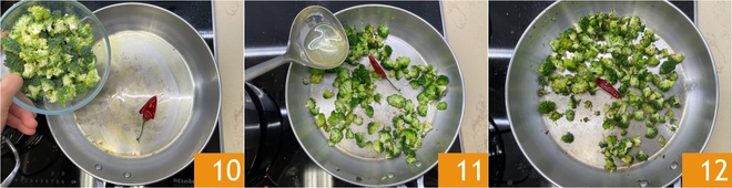 Añade las flores de brócoli 10 y saltéalas a fuego medio durante unos 5 minutos, luego baja el fuego, sala y continúa la cocción por otros 5 minutos, añadiendo un poco de agua caliente si es necesario 11. Una vez listas, reserva 12.