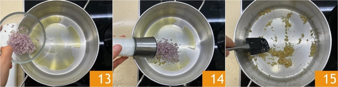 Limpia y pica la chalota. Vierte la chalota picada en una cacerola con un chorrito de aceite caliente 13, sala 14 y deja sudar a fuego lento durante unos diez minutos; debe volverse translúcida 15.