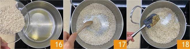 Retira la chalota de la sartén, seca el fondo y calienta otro chorrito de aceite. Vierte el arroz 16 y tuéstalo removiendo frecuentemente 17, hasta que los granos estén muy calientes al tacto. En este punto, sala y añade la chalota estofada 18.