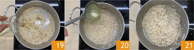 Desglasa con el vino blanco 19 y deja que se evapore completamente, luego lleva el arroz a cocción añadiendo un cucharón de caldo vegetal caliente a la vez 20, esperando siempre que el líquido se haya absorbido antes de añadir más 21.