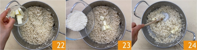 Una vez listo el risotto, retira la cacerola del fuego y manteca con la mantequilla fría 22 y el pecorino rallado 23. Mezcla bien para amalgamar 24.