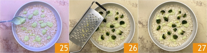 Sirve el risotto completando con la crema de brócoli 25 y las flores. Finalmente, aromatiza con cáscara de limón 26 y chile en polvo. ¡Tu risotto con brócoli y pecorino está listo para ser servido 27!