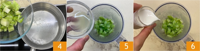Lleva a hervir una olla de agua con sal y blanquea las partes tanto externas como internas del tallo durante unos 5 minutos, o hasta que estén tiernas 4. Escurre y transfiere a un vaso, luego añade el jugo de limón 5 y la nata 6.