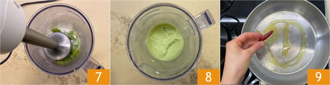 Tritura con una batidora de inmersión 7 para obtener una crema lisa y homogénea 8. Reserva y calienta un chorrito de aceite en una sartén con el chile fresco cortado a lo largo 9 y las ramitas de tomillo.
