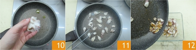 Mientras tanto, en una sartén antiadherente agrega muy poco aceite y caliéntala. Añade las cabezas y los tentáculos de los calamares reservados 10 y déjalos dorar. Gíralos de vez en cuando 11 y cuando estén bien dorados por todos los lados, transfiérelos a un bol y resérvalos 12.
