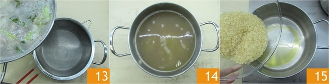 Tan pronto como el caldo esté listo, cuélalo 13 14 y mantenlo caliente. En otra cacerola calienta un poco de aceite y cuando esté caliente vierte el arroz 15.