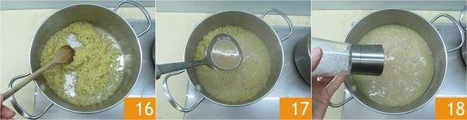 Mezcla y tuesta durante unos minutos 16. Desglasa con el caldo de calamar 17 y continúa la cocción añadiendo más caldo cuando sea necesario. A mitad de cocción ajusta de sal 18.