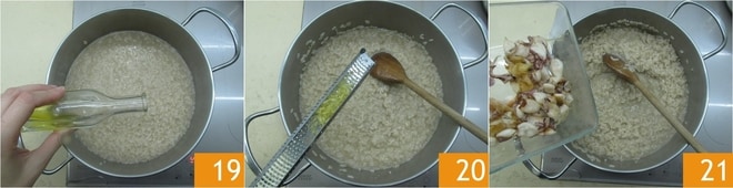 Cuando el arroz esté cocido apaga el fuego. Incorpora un poco de aceite 19. Añade la ralladura de limón 20 y los calamares, reservando algunos para la decoración 21.