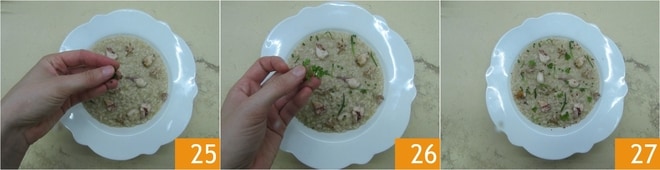 Decora con los calamares reservados 25, cebollino picado finamente y ramitas de cerraja y estragón 26. Termina con un espolvoreado de pimienta rosa 27 y sirve tu risotto bien caliente 27.