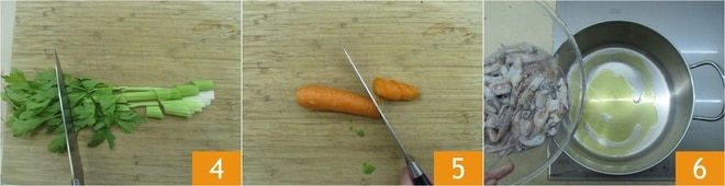 Haz lo mismo con el apio 4 y las zanahorias 5. Reserva todas las cabezas y algunos tentáculos de los que habrás eliminado los ojos. Calienta una olla con un poco de aceite y añade los tentáculos con los ojos y todos los calamares enteros 6.