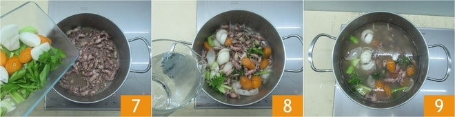 Déjalos dorar bien a fuego alto, luego añade el apio, la zanahoria y la cebolla 7, y deja que se impregnen de sabor por unos minutos. Luego vierte el agua 8 y deja cocinar a fuego medio durante unos 20 minutos 9.