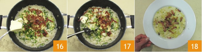 Finalmente, añade una pizca de pimienta, la mantequilla 16 y mezcla bien para mantecar 17. Solo te queda emplatar el risotto con repollo, speck y fontina y buen provecho 18!
