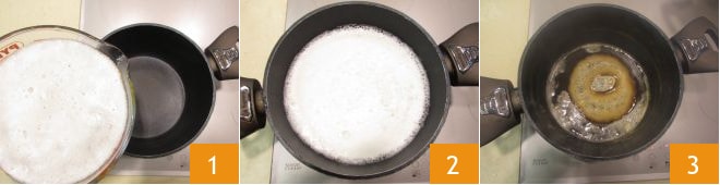 Como primer paso, comienza a preparar la reducción de cerveza. Recomendamos prepararla el día anterior y conservarla a temperatura ambiente. Coloca una olla al fuego, vierte la cerveza dentro 1 y sube el fuego al máximo. En cuanto la cerveza se caliente, comenzará a formarse espuma 2. Ten cuidado porque la cerveza tiende a subir y podría salirse de la cacerola. Luego baja el fuego y cocina durante aproximadamente 1 hora 3, mezclando de vez en cuando hasta que la parte alcohólica se haya evaporado completamente y hayas obtenido una consistencia similar al caramelo, de color ámbar.