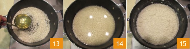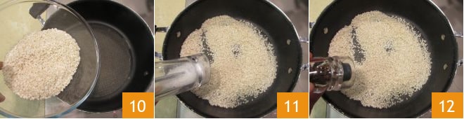 Pasa ahora al arroz. Calienta una cacerola, añade el arroz dentro 10 y tuéstalo en seco, mezclándolo de vez en cuando. Durante la tostatura añade una pizca de sal 11 y una pizca de pimienta 12.