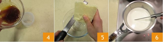 Luego déjala enfriar y transfiérela a un biberón de cocina 4. En este punto, prepara el caldo vegetal y, una vez colado, asegúrate de que al momento de cocinar el risotto esté en ebullición. Pasa a la crema de Grana Padano. Rállalo en el momento, utilizando un rallador para zeste 5, solo así obtendrás la consistencia final correcta de la crema. Vierte la nata en un cazo y caliéntala al fuego hasta alcanzar la temperatura de aproximadamente 70° 6.