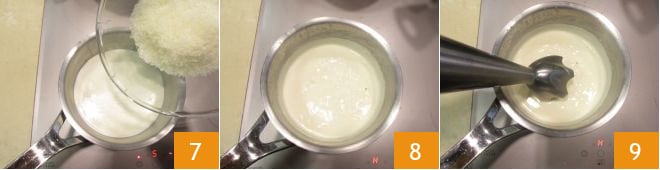 Añade el Grana Padano rallado 7 y mezcla con una varilla para amalgamarlo 8. Cuando el queso esté completamente disuelto, tritura la crema con un minipimer 9. Una vez obtenida la consistencia correcta, conserva la crema en un baño maría a 60° para mantenerla caliente.