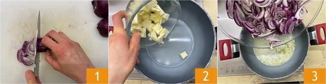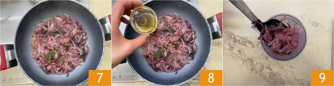 La cebolla deberá quedar blanda y seca 7. Desglasa con el vinagre de vino blanco 8 y deja que se evapore, luego transfiere las cebollas a un vaso de batidora 9.