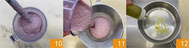 Tritura con la batidora de inmersión hasta obtener una crema lisa y aterciopelada 10. Tamiza la crema a través de un colador 11 para hacerla más homogénea. Pasa a la cocción del arroz: en una cacerola, calienta un chorrito de aceite 12.