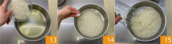 Vierte el arroz 13 y sala 14. Cuando el arroz esté bien tostado y caliente, desglasa con vino blanco 15 y deja que se evapore.