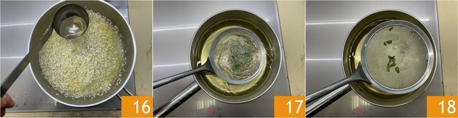Cocina durante 10 minutos, añadiendo el caldo poco a poco; asegúrate siempre de que el líquido esté hirviendo y que el anterior se haya absorbido 16. Mientras tanto, fríe durante unos instantes las hojas de salvia en aceite de semillas caliente a 170° 17, el tiempo justo para que queden crujientes, luego escúrrelas 18.