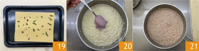 Ponlas en una bandeja cubierta con papel absorbente para secar el aceite 19 y reserva. Transcurridos los 10 minutos de cocción del arroz, vierte la crema de cebolla en la cacerola 20 y continúa cocinando durante otros 2 minutos. Apaga el fuego 21.