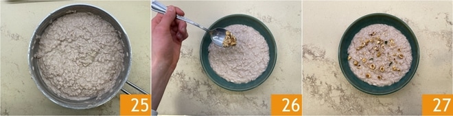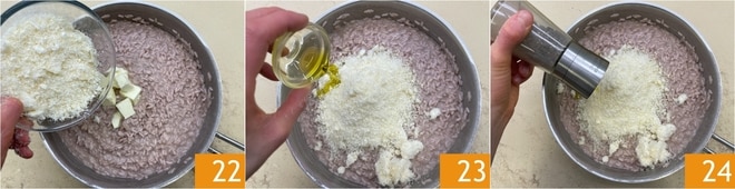 Manteca con Parmigiano Reggiano rallado, mantequilla fría 22 y aceite 23. Finalmente, echa pimienta al gusto 24.