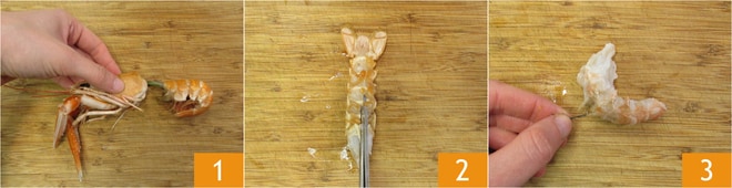 Para preparar el risotto con espárragos y cigalas, empezad por limpiar las cigalas: separad la cabeza del cuerpo 1 y reservadla, abrid con la ayuda de unas tijeras la cola 2 y extraed la carne de la cigala, reservando la cola con la cabeza. Eliminad el intestino tirando con los dedos 3 o con la ayuda de un palillo.