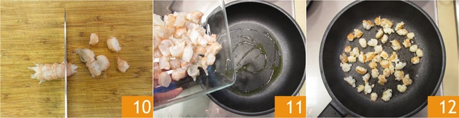 Cortad las cigalas en trozos de aproximadamente 1 cm 10. Rehogadlas brevemente en una sartén antiadherente a fuego alto 11 y luego reservadlas 12.