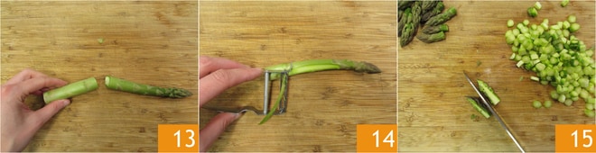 Limpiad los espárragos, eliminad la parte dura del tallo 13 y pelad el resto del tallo con un pelador, dejando intacta la punta 14. Cortad en rodajas de aproximadamente 2 mm y dividid las puntas por la mitad 15.