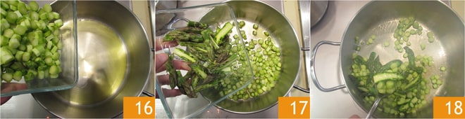 Rehogad los espárragos con un poco de aceite en una cacerola de bordes altos que luego usaréis para cocinar el arroz 16 17. Retiradlos de la cacerola y reservadlos 18.