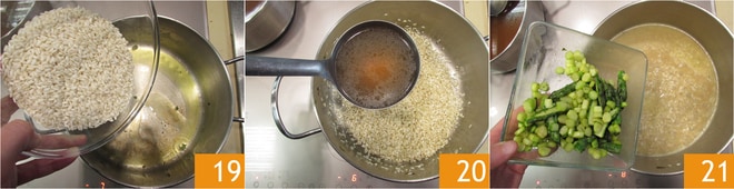 Dejando el fuego a media intensidad, verted el arroz 19 y tostádlo brevemente, luego añadid un cucharón de caldo 20. Proceded con la cocción utilizando siempre el caldo para mojar el arroz y, después de unos 5 minutos, añadid los espárragos 21 (reservando algunos para decorar el plato).