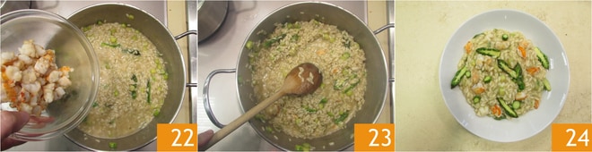 Salad, pimentad y continuad la cocción hasta que el arroz esté listo. En este punto, apagad el fuego, añadid las cigalas 22 (reservando algunas para decorar el plato) y mezclad con el aceite 23. Si es necesario, para mezclar, podéis añadir un poco de caldo. Ajustad de sal y pimienta y vuestro risotto está listo para ser servido, decorad el plato con los espárragos y las cigalas que habéis reservado y una pizca de pimienta. Servid el risotto con espárragos y cigalas bien caliente 24.