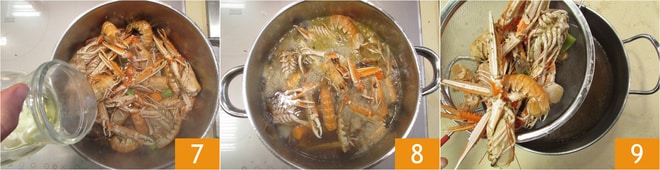 Rehogad a fuego alto durante unos 5 minutos. Cuando los caparazones hayan tomado un color vivo y brillante, añadid vino blanco 7 y dejad evaporar, luego añadid agua hasta cubrir y dejad cocer durante unos 10 minutos 8. Una vez terminado, filtrad el caldo con un colador de malla fina en otra cacerola 9 y mantenedlo a fuego lento; servirá para la cocción del risotto.
