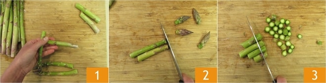 Para preparar el risotto con espárragos, comienza con la limpieza de los espárragos: rompe con las manos la parte más dura del espárrago, que usarás para el caldo 1. Corta las puntas de los espárragos 2 que servirán para guarnecer el risotto y corta en rodajas finas el resto de los espárragos 3.