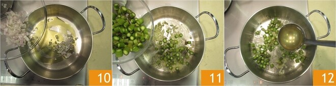 Sofríe durante unos minutos con un poco de aceite 10, añade la mitad de tus rodajas de espárragos 11, cocina un par de minutos removiendo de vez en cuando, ajusta de sal y cubre con un cucharón de caldo 12.