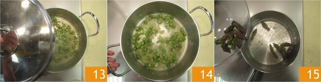 Ahora deja cocinar unos 5 minutos con tapa 13. Luego deja enfriar 14. Escalda en agua con sal durante un par de minutos las puntas de los espárragos 15.