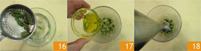 Enfríalas en agua con hielo 16, para que mantengan un bonito color brillante y permanezcan crujientes. Mientras, las rodajas de espárragos estarán tibias, tritúralas con 15 g de aceite 17 18.