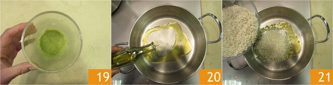 Deberás obtener una crema lisa y bien verde 19. Ahora tienes todos los componentes para comenzar la cocción del risotto: en una sartén ancha, calienta un poco de aceite 20. Tostar el arroz durante 3-4 minutos añadiendo una pizca de sal 21.