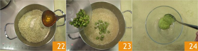 Mójalo con el caldo 22 hasta cubrir el arroz y continúa la cocción añadiendo más caldo cuando sea necesario. A mitad de cocción, añade las rodajas restantes de espárragos 23 y sigue cocinando el risotto ajustando de sal si es necesario. Reserva un par de cucharadas de crema 24.