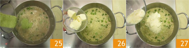 Cuando falten 2-3 minutos para la cocción del risotto, añade el resto de la crema 25. Al terminar la cocción, deja reposar el risotto cubierto durante dos minutos. Manteca con mantequilla 26, el queso rallado 27.