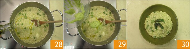 Añade una pizca de pimienta, un poco de aceite 28 y la crema de espárragos restante 29, remueve enérgicamente. Sirve el risotto con espárragos bien caliente adornando los platos con las puntas de espárrago reservadas 30.