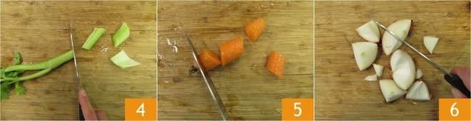 Lava las verduras para el caldo, luego corta en trozos grandes el apio 4, las zanahorias 5 y la cebolla 6.